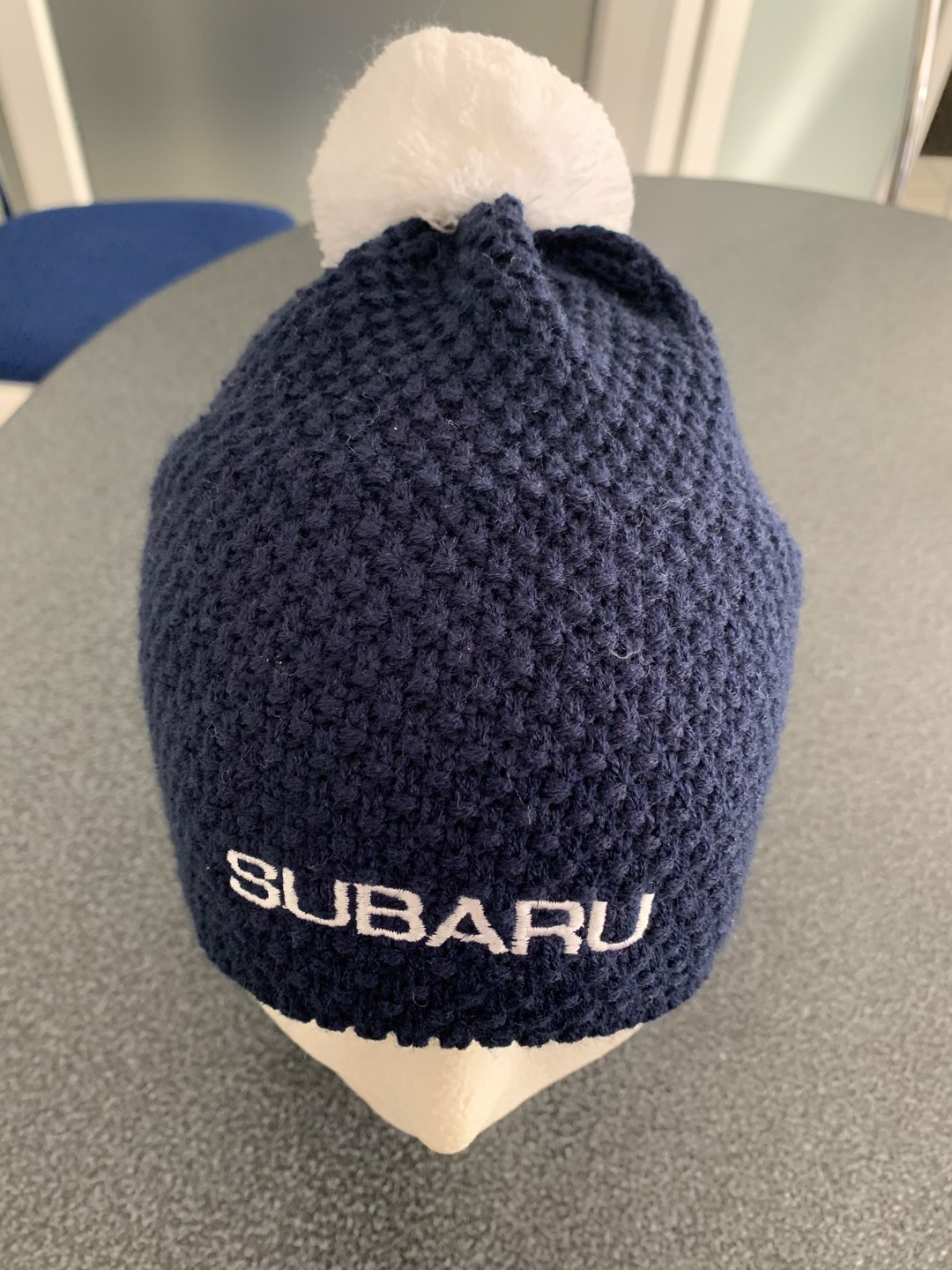 Tmavě modrá čepice s bílou bambulí a malou výšivkou značky SUBARU