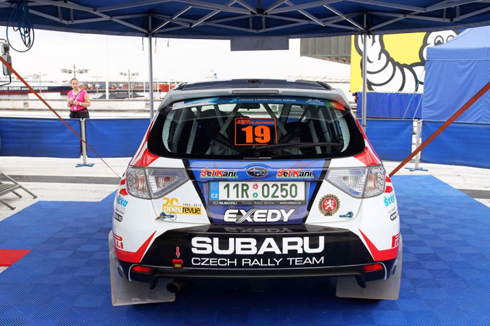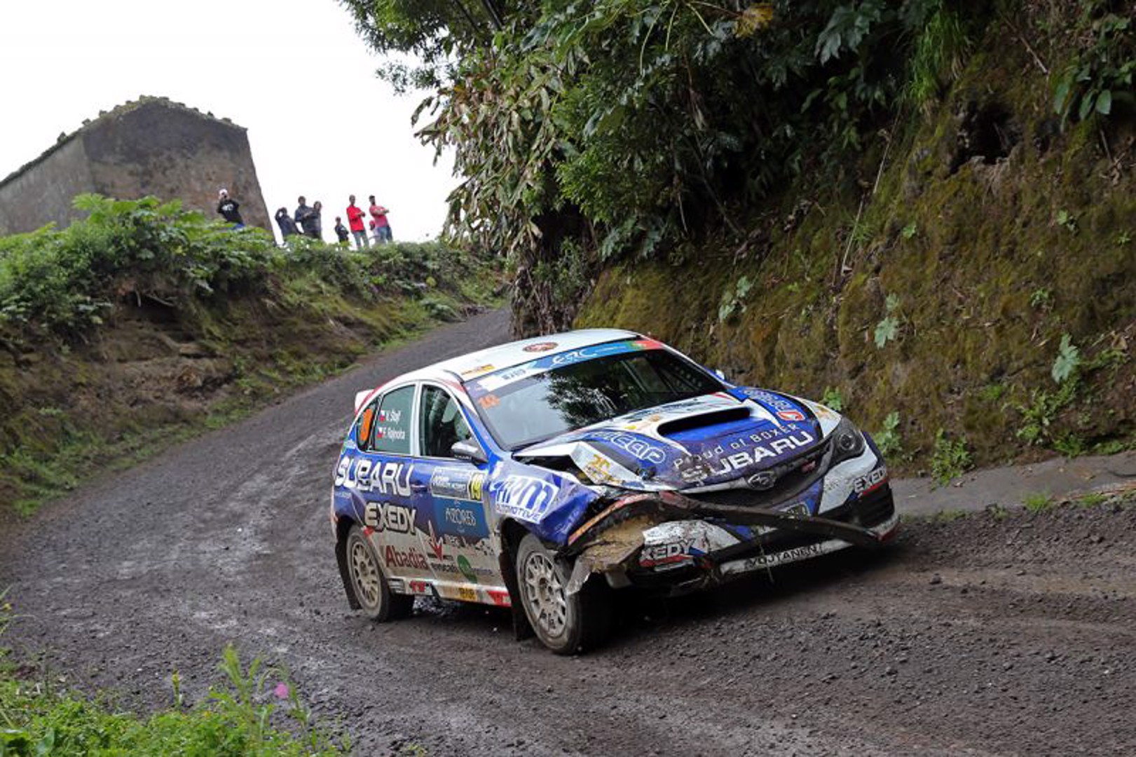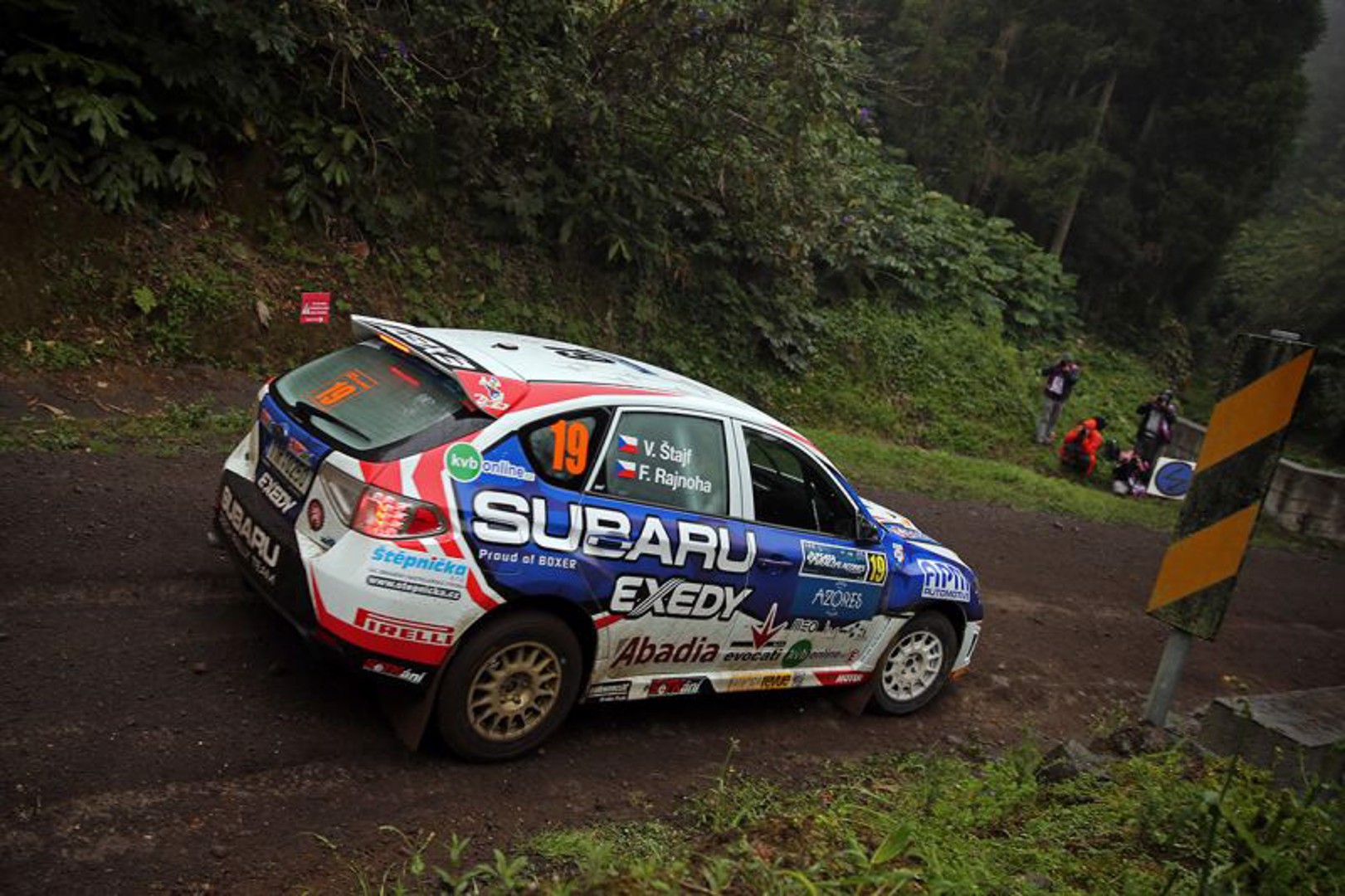 Vojtěch Štajf s Františkem Rajnohou mají za sebou premiérový start na šotolinové portugalské Rally Acores, která se jela v podmínkách pro naši posádku dosud zcela neznámých a která byla čtvrtým zastavením letošního Mistrovství Evropy v rally. Soutěž na Azorských ostrovech byla pro ně a jejich Subaru Impreza WRX STI nakonec velmi úspěšnou, přestože to nedlouho před jejím startem vypadalo všelijak. „Stejně jako na jiných podnicích evropského šampionátu, i tady se jela před startem kvalifikační zkouška, podle jejíhož výsledku se určovalo startovní pořadí pro první etapu soutěže,“ vysvětluje pražský jezdec. „Před vlastní kvalifikací nám bylo pochopitelně umožněno, abychom si její trať projeli nanečisto. Pro nás to byla premiéra na šotolinové soutěži, a tak jsme absolvovali první průjezd zkouškou velmi opatrně, protože pršelo a my nevěděli, co všechno si můžeme na mokré šotolině dovolit. Výsledný čas tomu i odpovídal, rozhodl jsem se tedy, že naopak při druhém průjezdu pojedeme maximální nasazení, které jsem pokládal za bezpečné. Jak se ukázalo po dvou kilometrech trati, můj odhad nebyl správný a do jedné ze zatáček jsem přijel rychleji, než naši soupeři, hlavně ale rychleji, než bylo zdrávo. Výsledkem bylo, že jsem na kluzkém povrchu nedokázal auto zastavit a po nárazu do kamenné zdi lemující trať jsem poškodil jeho pravou přední část. Naštěstí se nám ale podařilo s autem dojet do servisní zóny a protože zbývalo několik hodin do startu vlastní soutěže, naši mechanici se pokusili opravit škody. Ukázalo se, že nárazem neutrpěly žádné důležité části vozu jako motor nebo chladič, a tak se našemu skvělému týmu mechaniků oprava zdařila a vůz jsme mohli odvézt do předstartovního uzavřeného parkoviště ještě s půlhodinovou rezervou,“ s úlevou popisuje předstartovní drama Vojtěch Štajf.